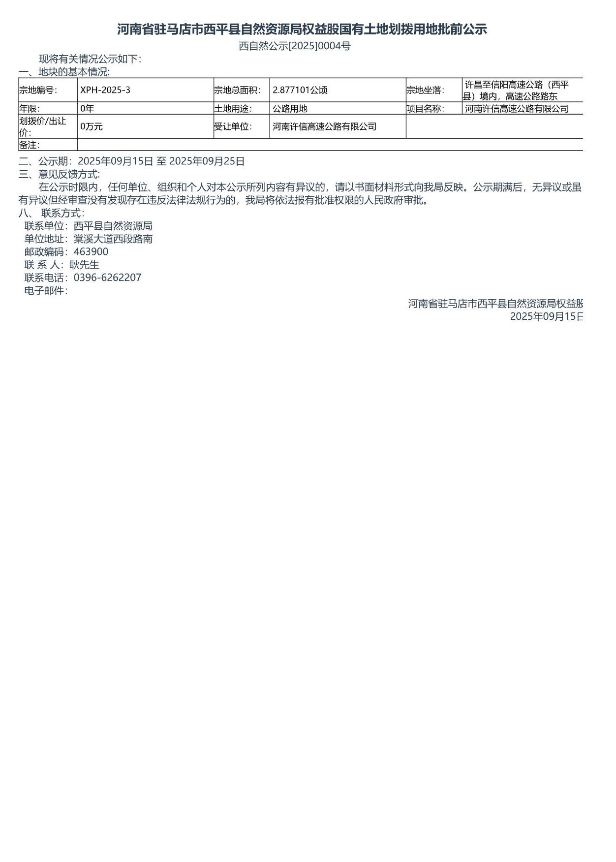 西自然公示[2025]0004号 河南省驻马店市西平县自然资源局权益股国有土地划拨用地批前公示